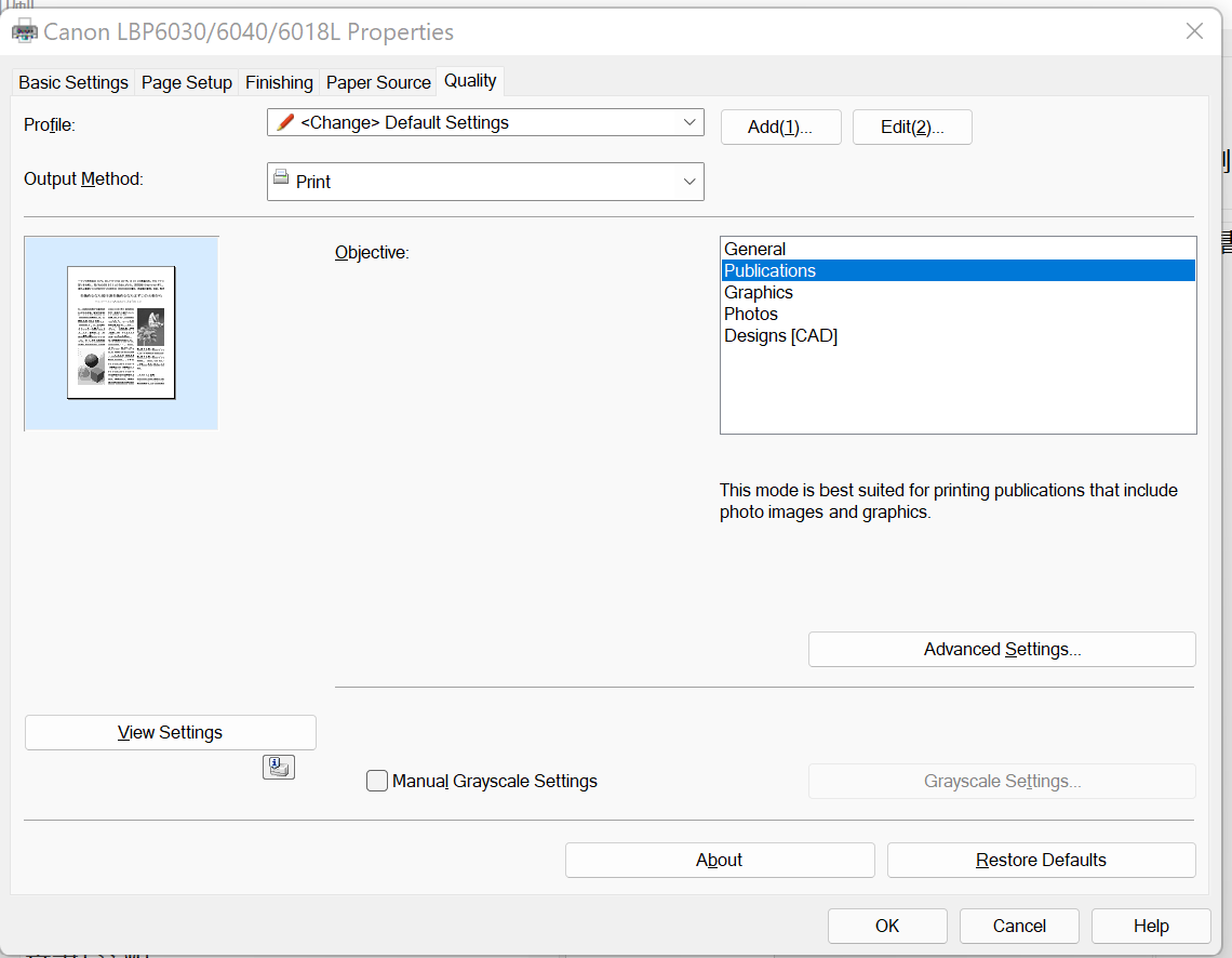 - 印刷設定→印刷品質→目的をPublicationsにする